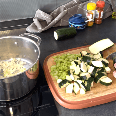 - U lonac s debelim dnom stavite narezani luk, tikvice i celer.
