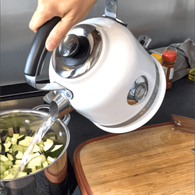 - Dodajte protisnuti češanj češnjaka i ulijte kipuću vodu – voda ne smije prekriti povrće.