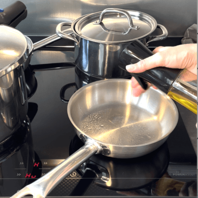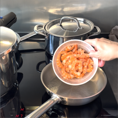 - Zagrijte tavu, dodajte maslinovo ulje i kozice.